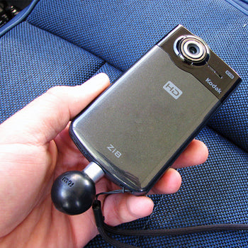 The RAM-B-166-A-237U consists of a 3.3" suction cup twist lock base, SHORT length double socket and 1" ball that contains a 1/4"-20 male camera thread. The suction cup base is designed to have a strong hold on glass and non-porous plastic surfaces, including RAM adhesive disks. The mount is designed with a RAM 1" diameter patented rubber ball and socket system that has adjustment points at both ends of the double socket arm this allowing for almost infinite adjustment and perfect viewing angles. The male thread matches most standard camera and camcorder female threads found on the bottom of the camera.