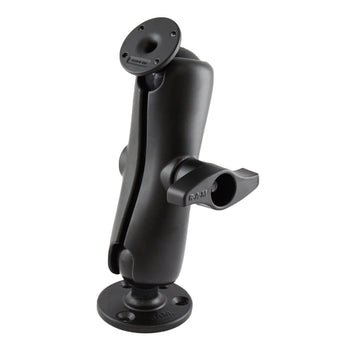 The RAM-D-101-254U consists of a 3.68" diameter round base, STANDARD length double socket arm and 2.43" diameter round base. The 3.68" diameter round base has pre-drilled holes, including two holes at 180 degrees and three holes at 120 degrees. The 2.43" diameter round base contains the universal AMPs hole pattern. Designed into the mount is a 2.25" diameter patented rubber ball and socket system with adjustment points at both socket ends of the arm. Rubber ball and socket technology allows for almost infinite adjustment and perfect viewing angles.